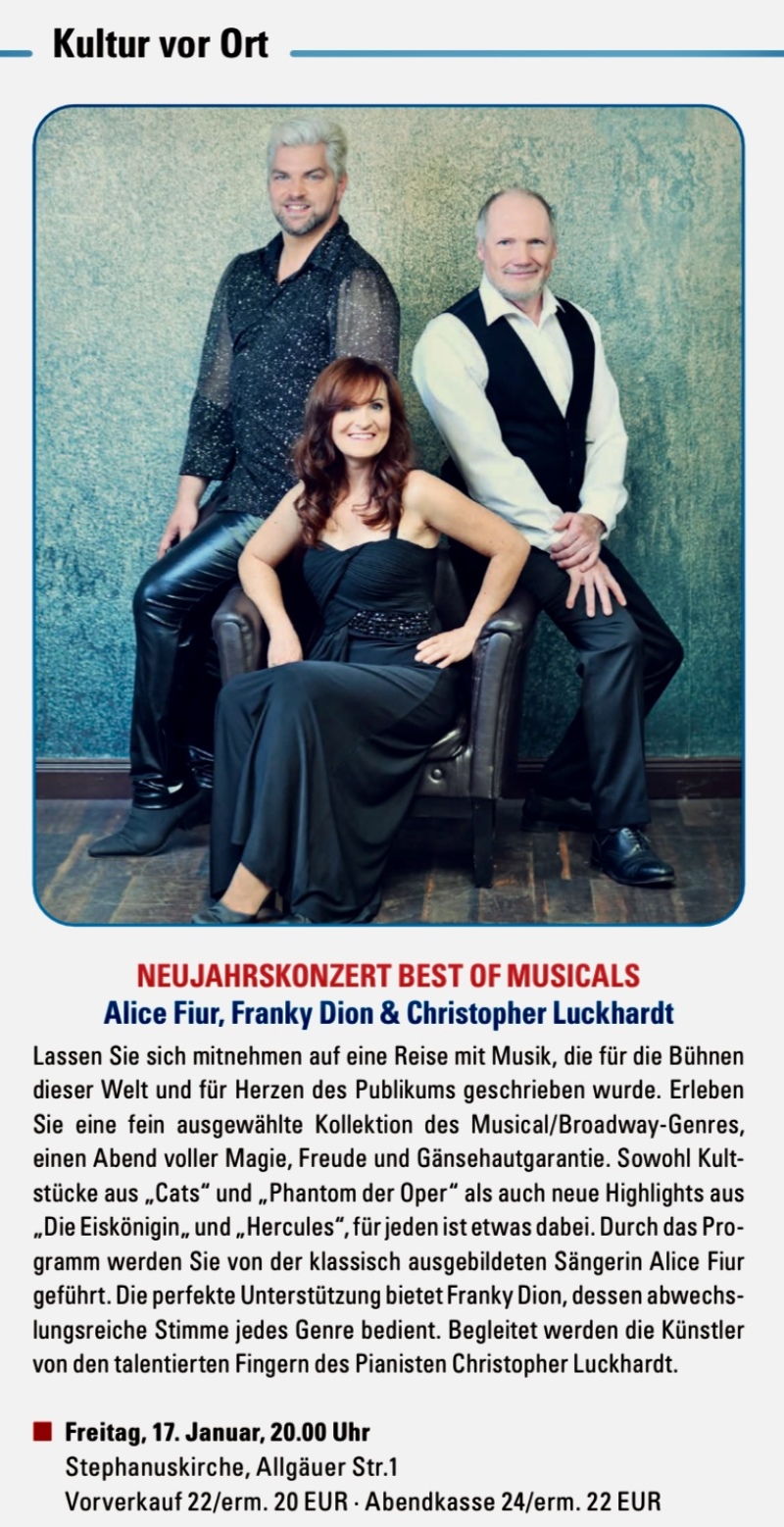 Sie werden durch die Musicalwelt von der klassisch ausgebildeten Sängerin Alice Fiur geführt. Die perfekte Unterstützung bietet Franky Dion,